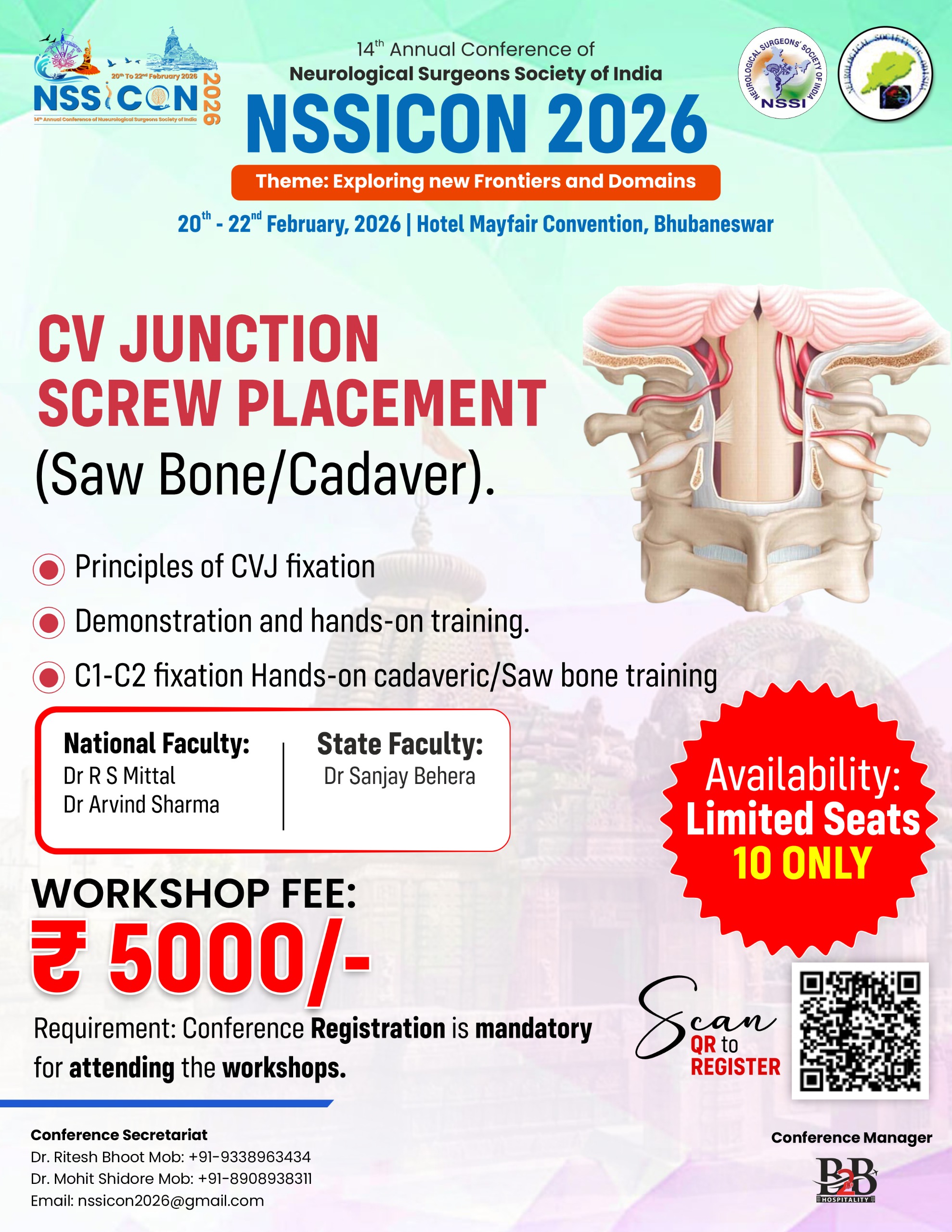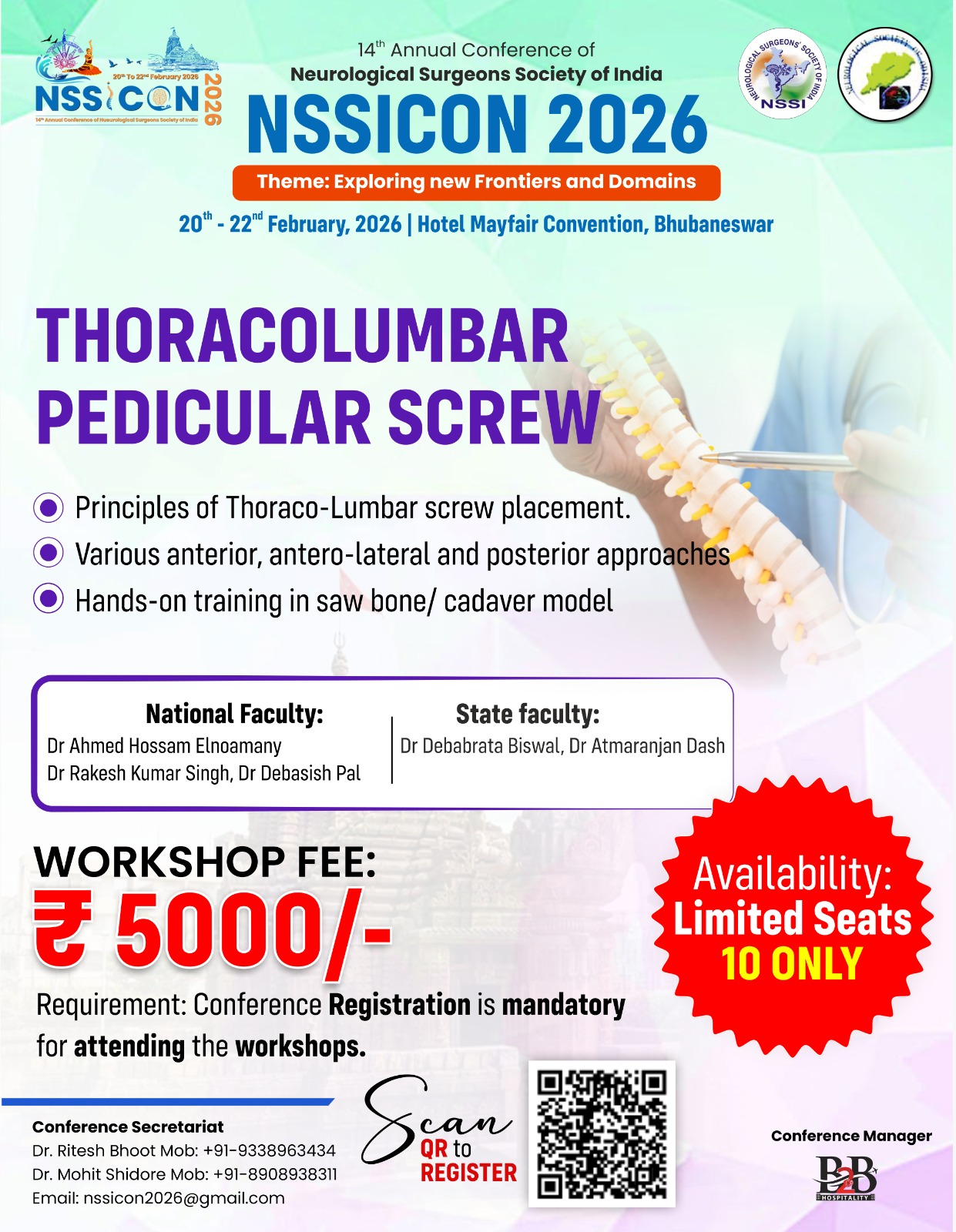 | Session 1 | Thoracolumbar pedicular Screw (Saw Bone/Cadaver) | 20th Feb 2026 | 10 Only | Rs 5000/- | 09.00 am - 12:30 pm |